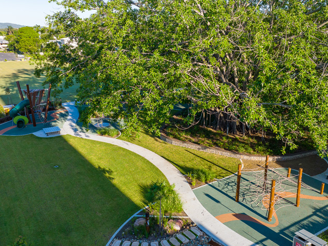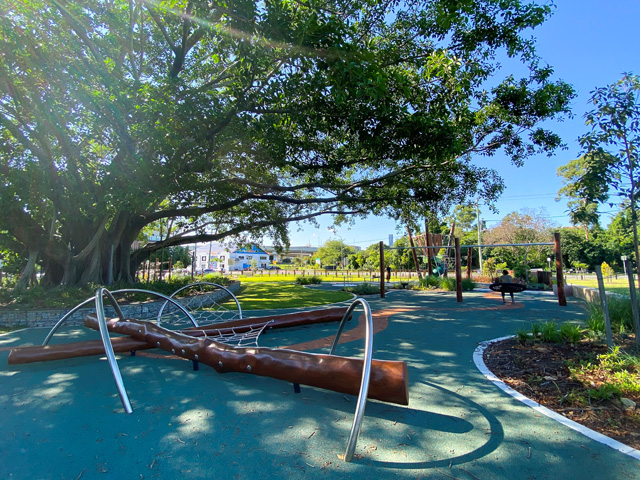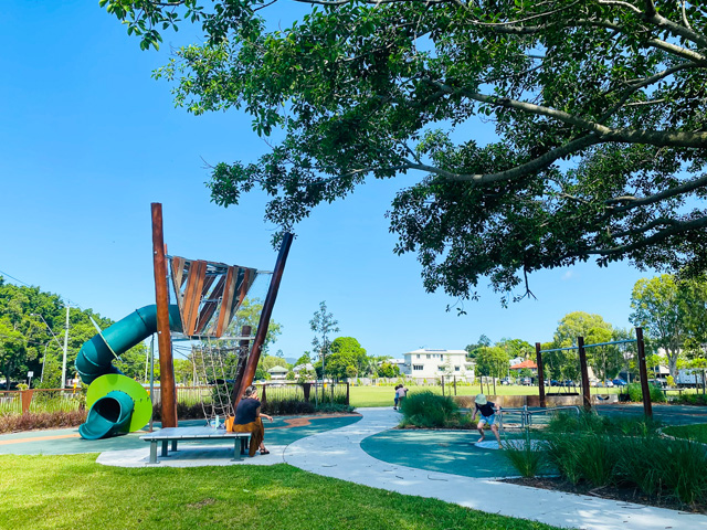 Designed by Playscape Creations, in conjunction with Brisbane City Council’s city design team, the park features custom play equipment fabricated and installed by Playscape Installations, including a treehouse-style tower that offers “at-height” views of the iconic fig tree onsite and the natural surrounds.