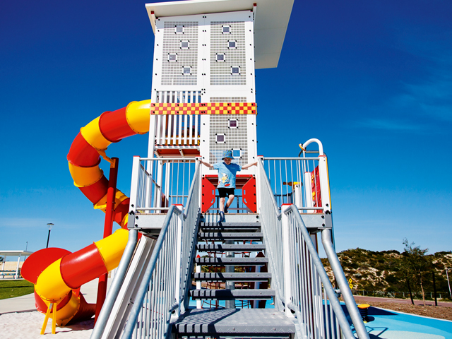 Highlighting the tower’s uniqueness is a giant spiral slide, which guarantees an exhilarating ride down, capping off a rewarding climb. Educational play panels are distributed across the tower, enriching children’s curiosity and understanding as they explore and engage. A particularly notable feature is an information panel explaining the FLAGS system used in surf lifesaving, providing a simple yet effective educational touch.