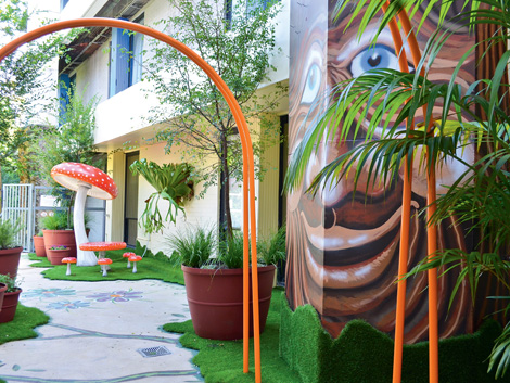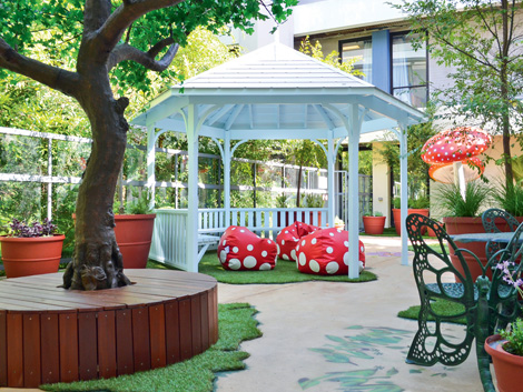 Designed to provide a safe and fun space for sick kids, the Happy Garden is decked out with an array of fanciful toadstools and giant flowers that form a wonderland for play.