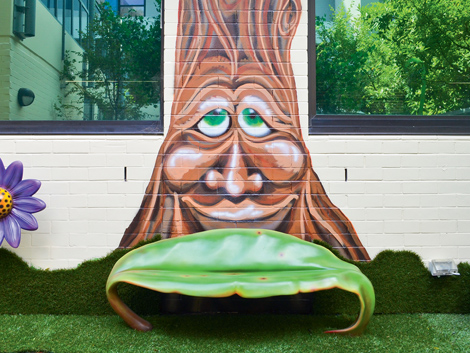 Renowned for the quality and magical whimsy of their play pieces, Jungle Play contributed two sculptural Giant Toadstools to the space, which provided shade and perfectly match the kid-sized Toadstool Table and Chair set that was also included in the design. In addition, Jungle Play Gum Leaf park benches were been dotted around the garden, one of which nestles beneath a life-sized tree mural, offering a cool place for visitors to sit and relax. Giant sculptural daisies can also be found in the Happy Garden. These larger-than-life colourful flower sculptures add vibrant charm – without the need for watering!