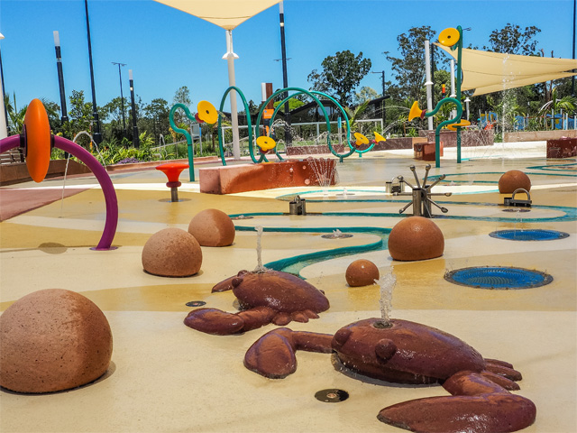 Remaining sensitive to the environmental concerns of the surrounding area, the aquatic park design incorporated elements unique to The Mill site and the Moreton Bay region. A snaking path throughout the park represents the Pine River, while custom-designed mud crabs pay homage to the local fauna. In addition, a water-discharge bucket in the form of a “paper scroll” serves as a reminder of the site’s history.