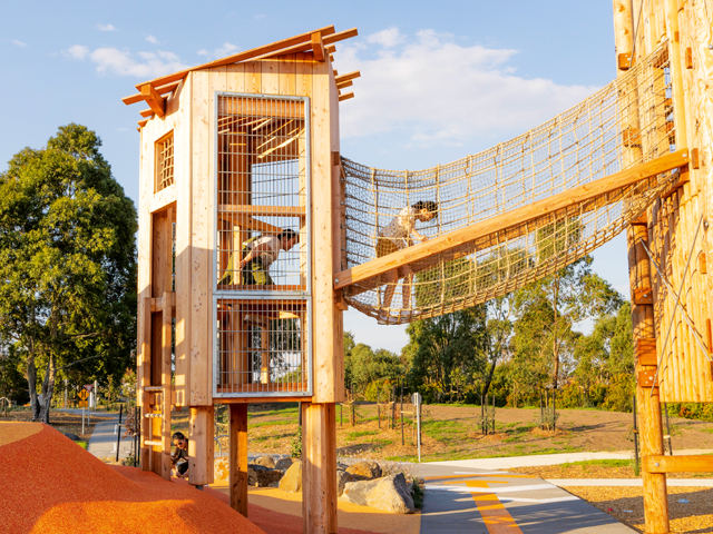 Expertly handcrafted in Germany, Richter Spielgeräte play equipment offers plenty of play value, with a focus on safety, stability and environmental friendliness. The use of sustainably forested timber is perfect for the Australian environment, ensuring longevity for councils, and embraces the perfectly imperfect unit unique. Combined with drinking fountains, public bathrooms, barbecue facilities, and more to come in Stage 2, Whittlesea Public Gardens has become a hotbed of family-oriented fun everyone to enjoy.