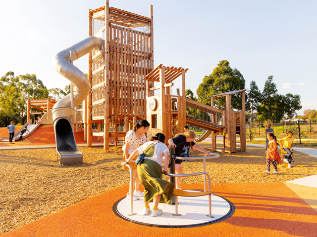 A wheelchair-accessible carousel and double flying fox, rope climbing unit, swings, in-ground trampolines, rockers and nature play elements complete the fun for the new playspace. In addition, a learn-to-ride track provides plenty of active fun for bike, skate and scooter enthusiasts of all abilities.