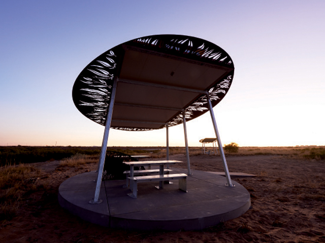 In 2014, Urban Art Projects (UAP) was called upon to design and fabricate road rest stops at 11 different locations throughout the Pilbara region in West Australia. These locations included: Halfway Bridge; Hamersley Gorge; Old Onslow Township; Robe River; 40 Mile; Miaree Pool; West Peawah; FMG Rail Lookout; 6 Mile; Cape Keraudren; and Marble Bar Road. UAP had the role of lead consultant for the project.