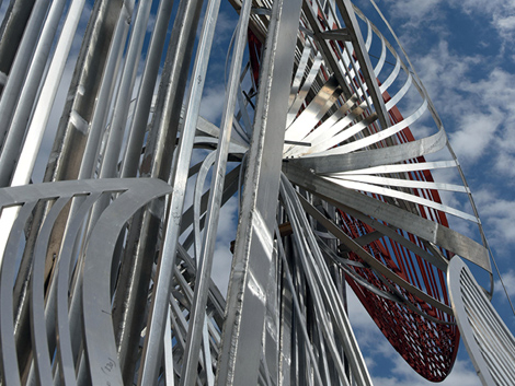 As the engineers were concerned the sail structure, being 16m-high, would act like a true sail on windy days and have to bear a huge load at the base of the sculpture, Plowright was required to establish five buttresses to provide strength and stability.