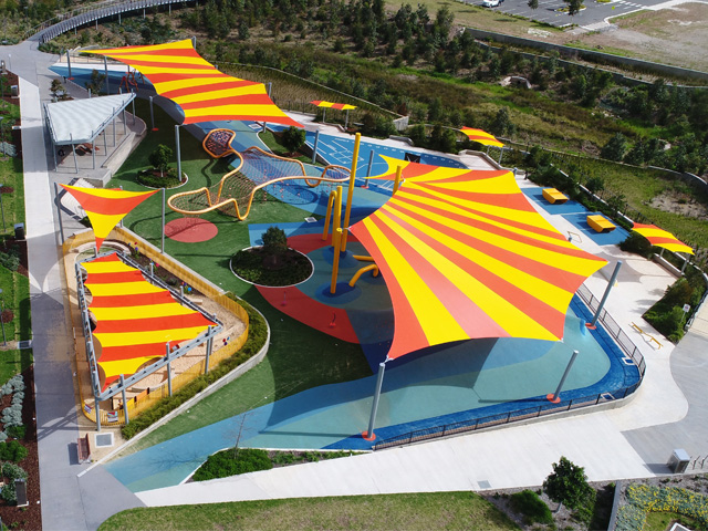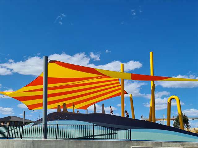 Unique in their brightness and shape, the shade sails are a dominant visual feature of the park. Rising to heights of up to 10 metres, the structures provide exceptional coverage over a variety of areas, while also ensuring they stand as a focal point for the neighbourhood and give the locals of Gregory Hills pride in their community.