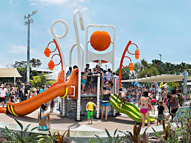 Gladstone Aquatic Centre features a 50-metre outdoor pool and a 25-metre indoor pool, and a water play zone known as the Splash Zone. This fun, sensory play area is designed with zero-depth pools for children up to 12 years of age and includes a splash pad, slides, water jets, cannons, sprays and bubblers, and a giant tipping bucket at its centre: a six-metre-high structure that fills with 500 litres of water in nine seconds before tipping its contents on the breathlessly waiting children below.