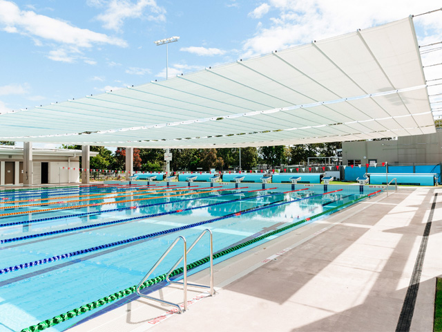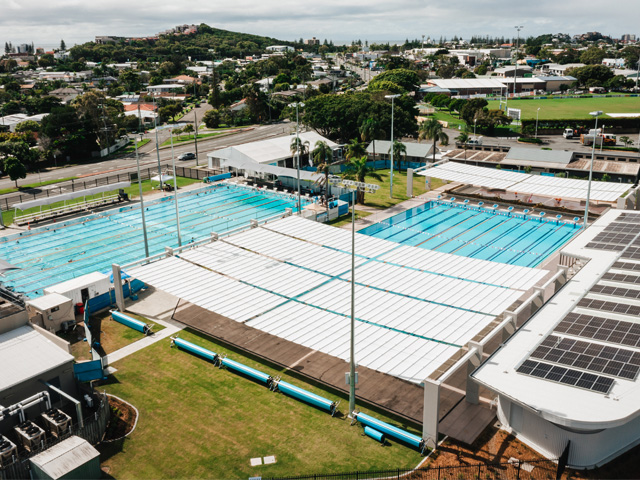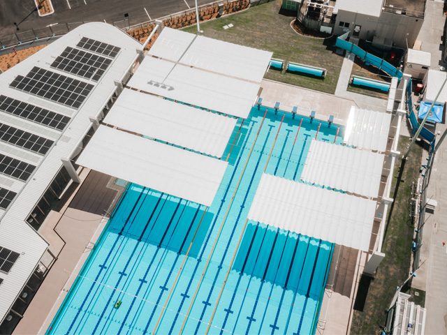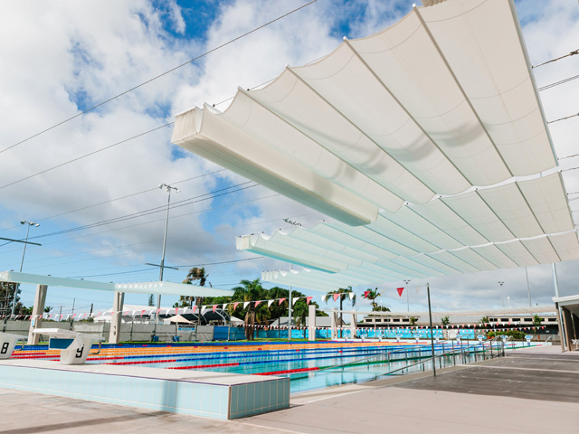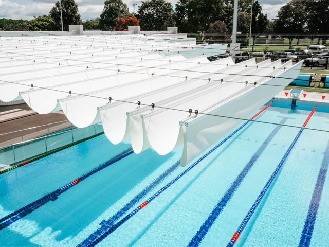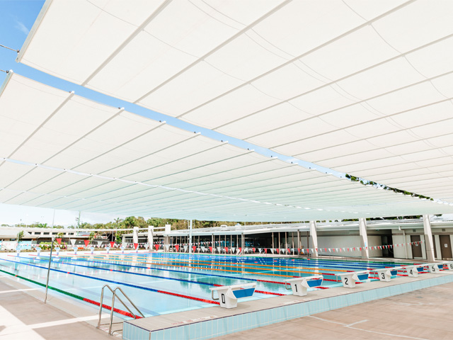 A retractable shade system stands up to the Queensland sunshine at Miami’s newly refurbished aquatic centre.