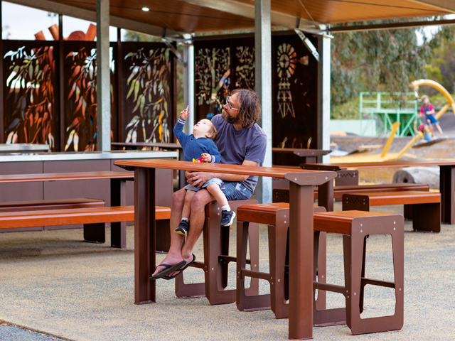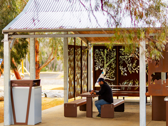 One of the biggest factors at play in the park’s upgrade was the inclusion of wheelchair accessible amenities. To ensure premium usability for the whole community, GX Outdoors supplied a complete solution with a powdercoated table and bar settings. As council wanted to ensure the new infrastructure blended with the natural environment, they chose a Western Red Cedar TimberImage finish over aluminium slats, giving the structures the look of timber with the longevity of modern materials.
