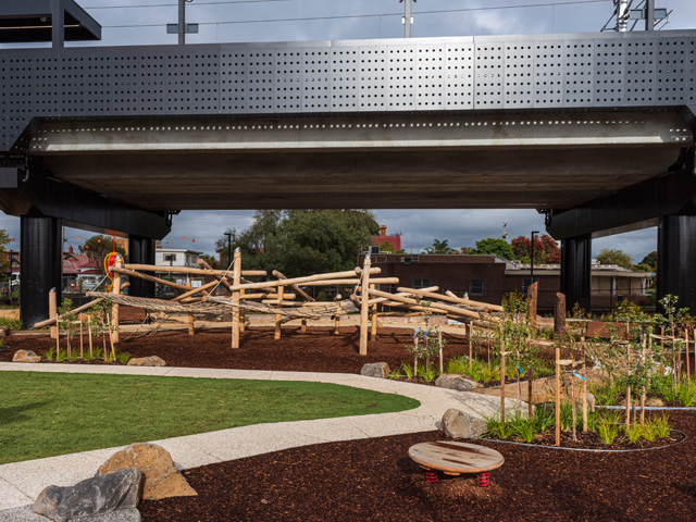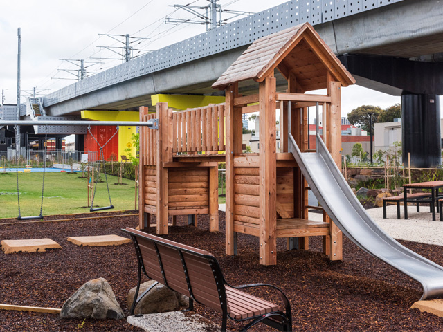 Situated under the elevated train station of Moreland in Coburg, Victoria, this newly constructed public space includes a playspace utilising Richter Speilgerate play structures.