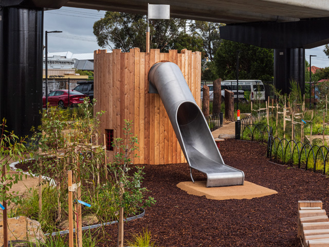 Suitable for a number of children to make use of at any given time, Coburg’s newest playspace is a welcome addition to the area and a clever use of underutilised space beneath the transport hub.