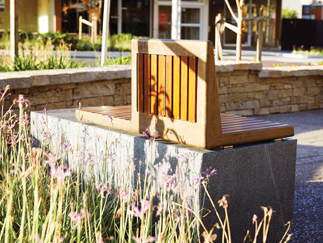 The long and sinuous contour seat at the heart of the streetscape, which mimics the snaking movement of a dragon, is custom designed to fit within the edge of two planting areas to define gathering areas within the precinct.
