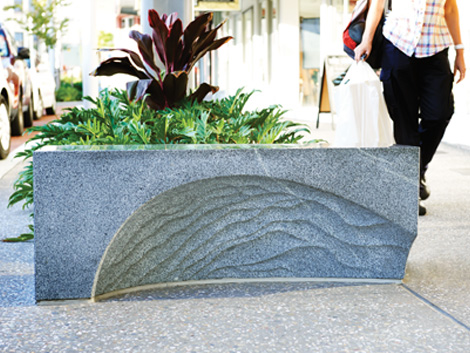 The final unique element of the design is a series of patterning embedded in the stone. A wave pattern was used on the contour seat and electrical box seat of the suite to represent the surface of water, with a carved-away element submerged beneath. The sand pattern used is a reference to the tidal sandbank patterns of Broadwater. Placed on the sub-surface of the units, this pattern also serves as a metaphorical reference to the surfacing and disappearing of the ‘dragon’ form that was the inspiration of the designs.