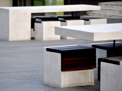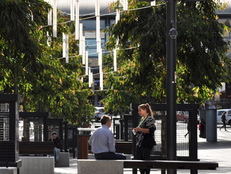 The design involved removing steps, stages, fountains, low retaining walls and other impediments to free access across the site. The solutions included all new paving, in part suspended over common planting trenches accommodating eucalyptus trees, a collection of custom furniture elements, and catenary feature lighting suspended from a series of multi-function lighting poles.
