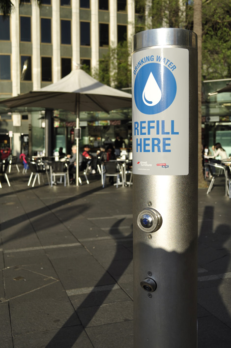 The Arqua Station was first launched by Street Furniture Australia (SFA) in 2008. It is the result of a collaboration with the environmental group Do Something! to develop a public drinking fountain and water-refill pole for single-use bottles, in order to reduce the impact of disposable plastic bottles on overall landfill.