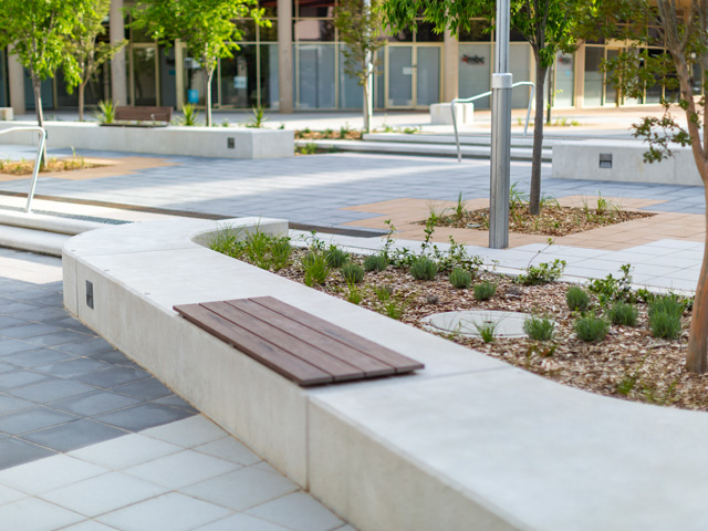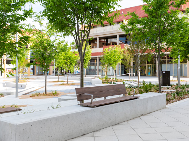 Working to a brief that required distinctive design and natural hues that would bring warmth to the space, StraBe collaborated with AECOM and Transport Canberra and City Services (TCCS) on the design and construction of the units needed to outfit the plaza. Contemporary street furniture and bike racks manufactured for durability and longevity dot the space, increasing functionality and usability in the area. But it is the shade structures that make all the difference!