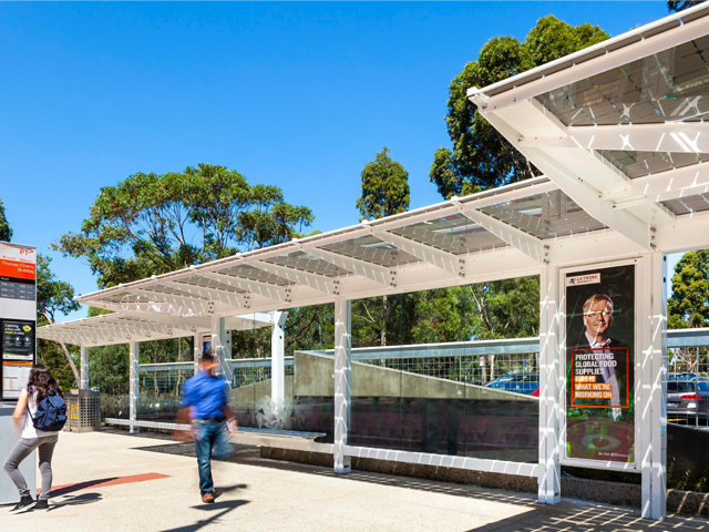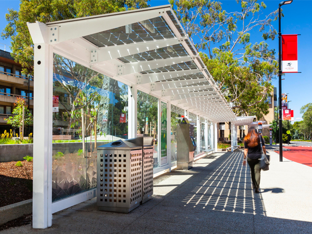 In keeping with the University’s brief, Stoddart Outdoor Infrastructure designed, manufactured and installed a series of ‘smart’ shelters, remaking the Science Drive bus terminus and creating a safer and more environmentally friendly shelter system. Architectural in design and innovative in application, the new university shelters are based on the Wellington Shelter design by Stoddart, with custom modifications to meet campus requirements.