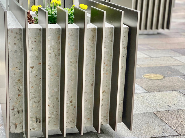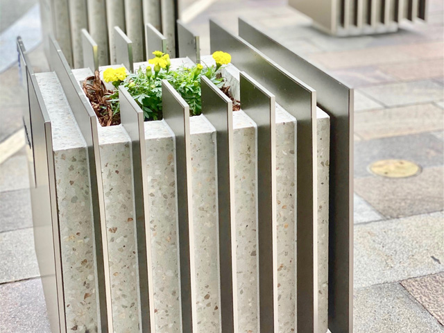 Showcasing a mix of white terrazzo concrete and bronzed metal, the finned design of the planters created by Benzini offers a three-dimensional look that gives the area an appealing texture. Both hardy and attractive, the planters are staggered across the forecourt edge, providing some much-needed greenery as well as forming a helpful safety barrier for pedestrians.
