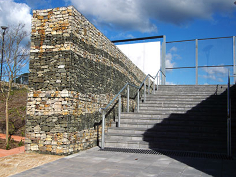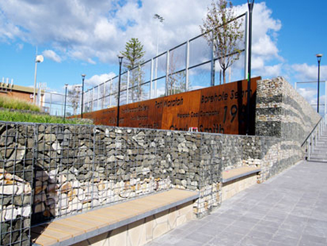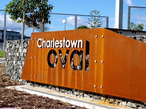 Charlestown Oval, NSW. This project was completed in 2010 and is notable for its use of different types of rocks to give an interesting effect. Another major feature of this project is the large panels of Corten steel which are part of the entrance for the sign and also is used as a feature wall. This together with the gabion walls and lush greenery has produced a beautiful public space. The gabion walls were built using Permathene's 75mm x 75mm in 4mm Galfan (Al 5 Zn 95), 4mm wire. Connections were with c rings.