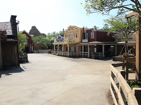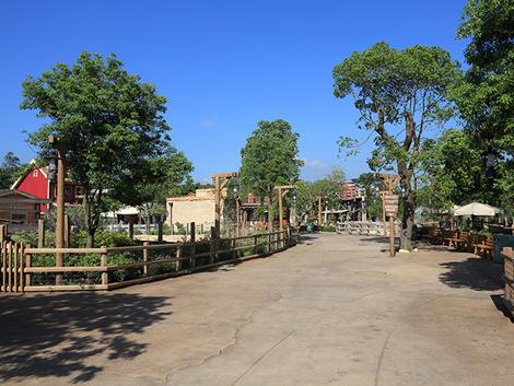 As part of the latest Hong Kong Disneyland expansion Design Landscapes was engaged to undertake the themed hardscape and softscape works for the Grizzly Gulch land themed to replicate a Wild West mining town with a hand carved mountain enclosing a roller coaster ride. The concrete works were themed to resemble a compacted dirt road with horse and cart tracks, bear prints and pot holes. All of the expansion joints were installed at random angles and no straight lines so as to look like cracks in the dirt road. The concrete was integrally coloured, was hand seeded with a variety of aggregates to reflect various levels of water washed dirt, the edges were rolled curbs themed to look like dirt build up. The surface was stamped, retarded and stained. Internal finishes included stamped timber flooring and acid washed concrete. The soft landscape was installed to give an immediate effect with mature tree transplants together with significant numbers of shrubs and ground cover all planted within 1500 mm depth of imported soil mix.