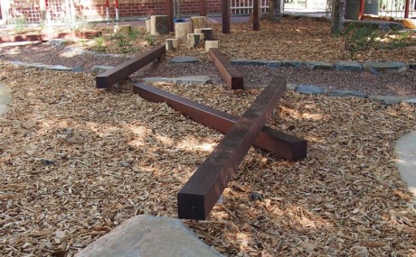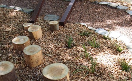 Large rocks, timber log stepping elements and balancing beams help define the space. A natural rock amphitheatre for outdoor learning was also incorporated. Textural materials were included in the design, compacted gravels, river pebbles and mulches all add to the subtle sensory experience.