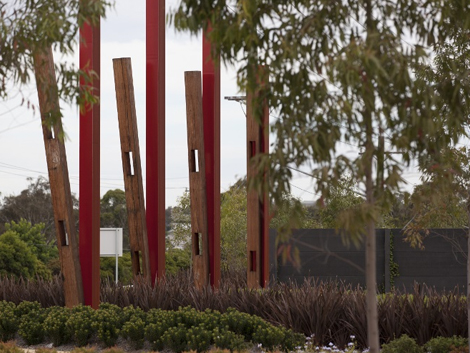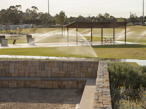 The site’s entry features a series of upright poles created from recycled timbers that extend up to 6m in length, Corten steel supports and a rock salt finished concrete pavement. The landmark-sized retaining walls remain the most significant component of works. Faced with sandstone cladding, the stonework is dry jointed and wet-fixed to concrete retaining walls – the largest of these being 4.5m tall and approximately 50m in length. Following completion of the construction