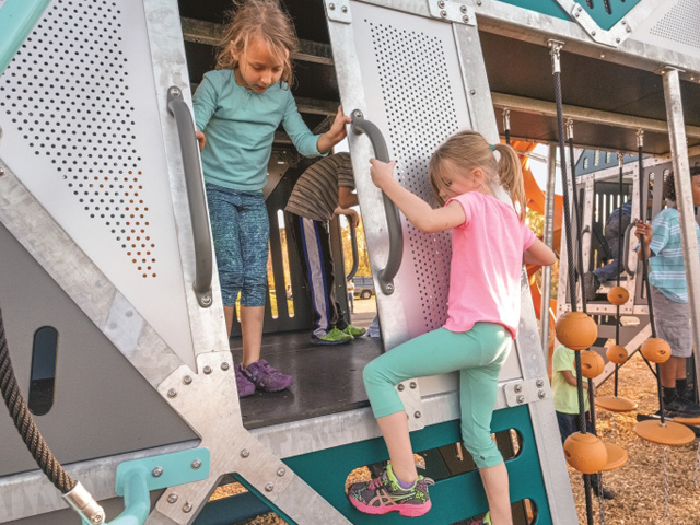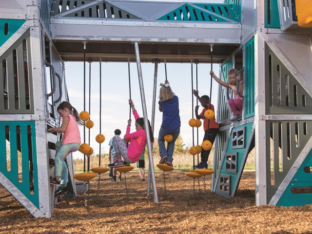 Exhilarating sliding comes in the form of the Tunnel Slide offering a thrilling ride 3.65m down as a reward for reaching the very top. The Double Swoosh Slide® - our steepest slide - lets kids slide two at a time racing down from the 2.4m deck. This new higher Double Swoosh Slide is part of the new Elev8 range launched by Landscape Structures last year – further promoting height challenge on the playground.