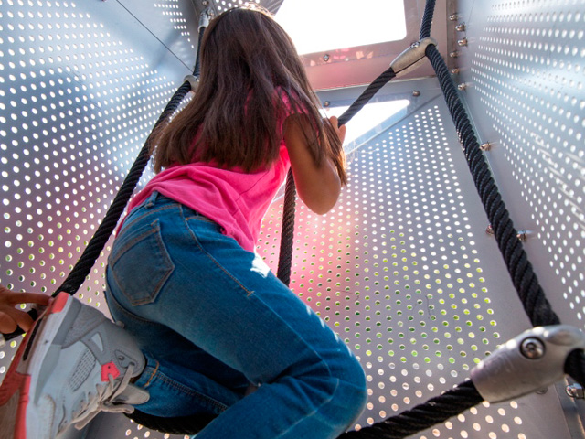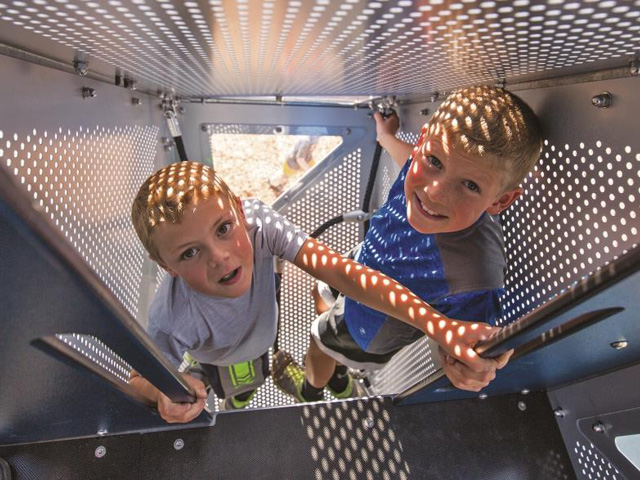 Multiple innovative climbing opportunities create an open invitation to scale the outside up to the 1.2m and 2.4m decks. Or they can reach these decks by climbing inside, ultimately reaching the fully enclosed 3.65m deck for an amazing view and a moment to reflect on their achievement. The compact interior will have them climbing and crawling to explore all the different activities along the way reaching further and further with each visit.