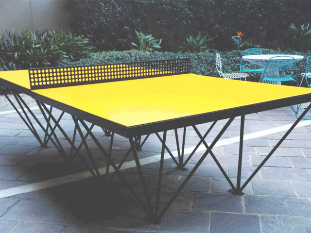 The MLC Centre in Sydney CBD was the tallest building outside of North America in 1977. Designed by architect Harry Seidler, it now dons an Ephemeralist Table by Public Outdoor Ping Pong. The designer table is a permanent feature in the courtyard (outside the foyer) for visitors, workers and shoppers to use at their leisure. Feast your eyes on the matt black and yellow colour palette (to match an existing sculpture) and the Buckminster Fuller frame.