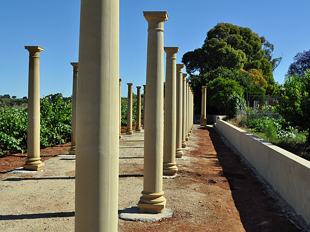 They wanted a classic look and feel, a touch of Ancient Greece and the early days of viticulture which began in the Neolithic period and thrived during the Bronze Age. To create this Ancient Greek style, 22 Doric round concrete columns on a pedestal were specified from CastStone. The columns were not painted but left to age naturally to give them an organic feel. CastStone’s precast sandstone columns and pillars can be painted to match the desired colour or left to age, as in the case of Greenock Creek Wines, picking up elements of their surrounds.