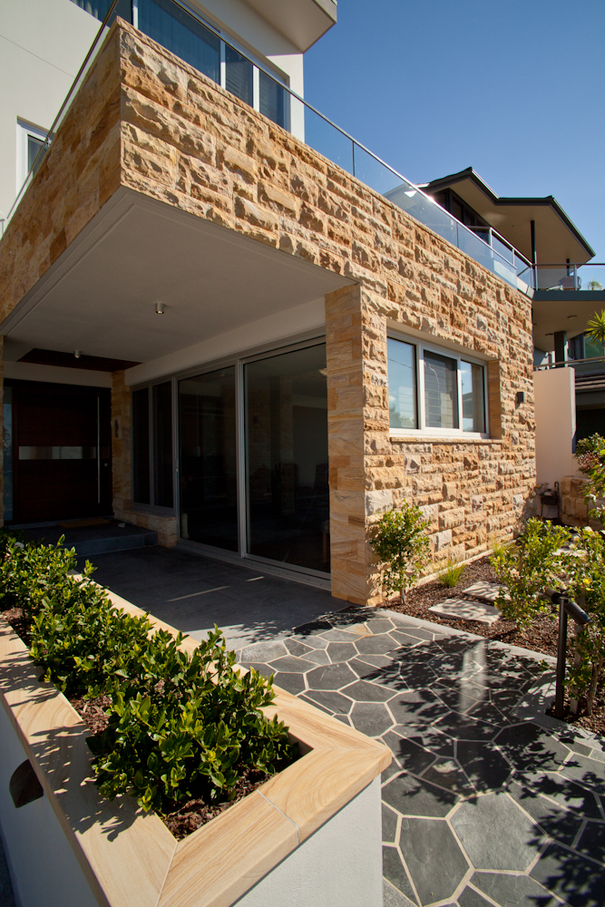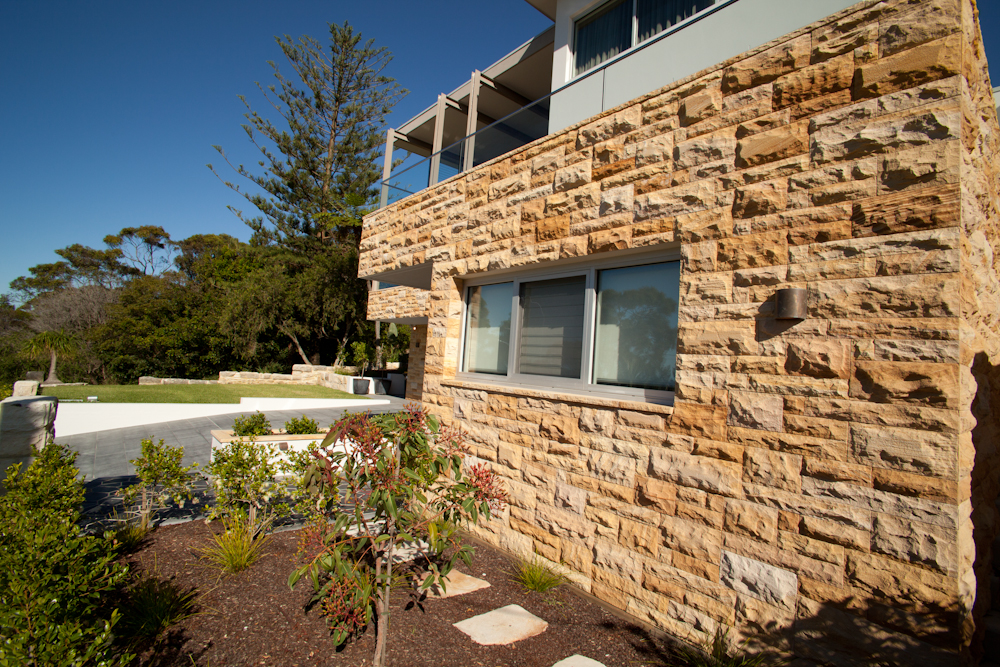 Over 120m² of Teakwood Sandstone Rockface was used to clad the front and side of the house and Teakwood Sandstone was also used for capping and paving.