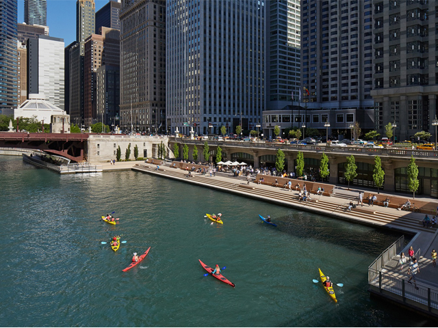 Connecting the city centre with the waterfront, Chicago Riverwalk is a multi-use public space that e...