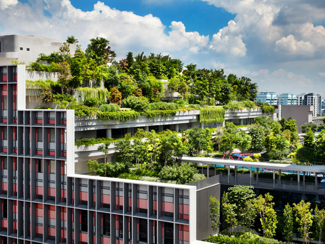 Perched above the Singapore skyline, this lush, multi-layered rooftop garden tops a prototypal devel...