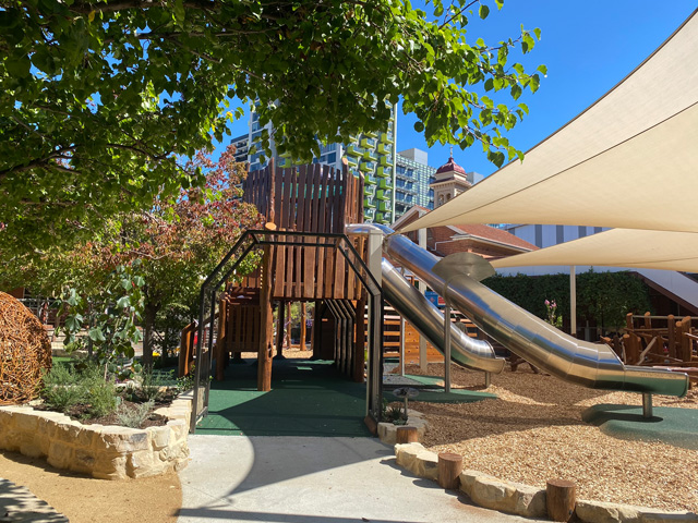 Glowing toadstools and woven arbors set the stage for this inner-city playscape. Situated on the gr...