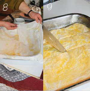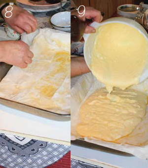 - Brush melted butter over each pastry sheet then lay each sheet in a crisscross pattern in a greased baking tray, making sure the sheets overlap the edges of the tray.