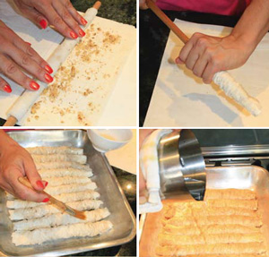 - Fold the pastry in half over the wooden handle and press flat. Apply another coat of oil at the end of the pastry so it will bond when rolled, then sprinkle 1 tablespoon of crushed walnuts over the folded pastry.