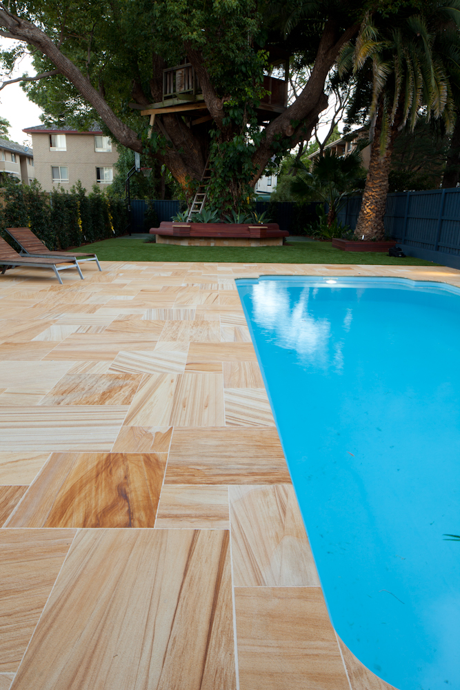 Nestled in the heart of Ashfield NSW, this oasis like property is beautifully finished with Teakwood Sandstone Jumbo Pattern. Teakwood Sandstone Jumbo Pattern is 30mm thick stone with a sandblasted finish in a variety of shapes that can be used for paving or wall cladding.