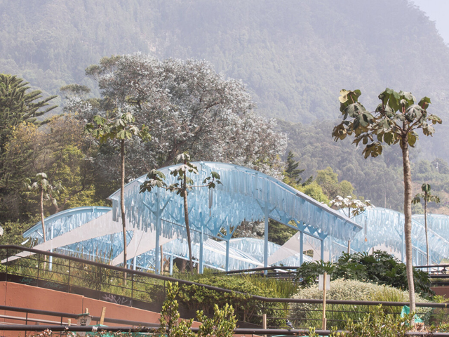 A shade structure in Bogotá, Colombia, pays homage to the river that historically traversed the region. Designed as a temporary art piece, Memoria del Rio replicates the ebbing and flowing of water with 15,000 fragments of blue fabric that blows in the wind.
