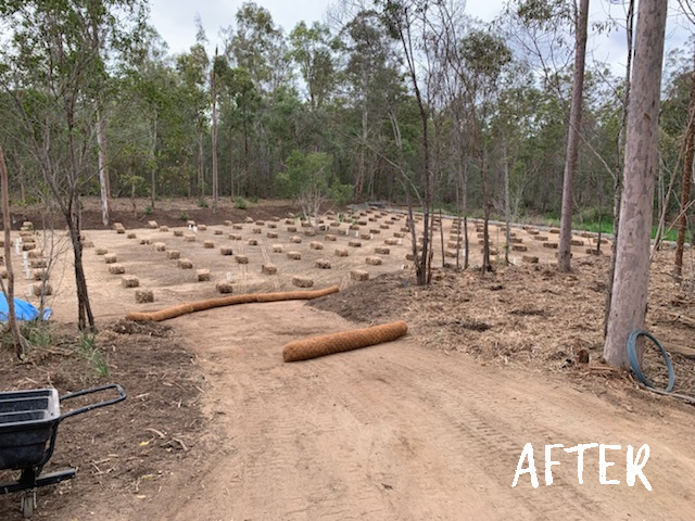 Noting the extensive amount of weeds blocking the batter of the basin, the team sprayed then removed the debris by hand, using a forestry mulcher to create maintenance access down the batter to the bioretention. Once cleared, batters were mulched and replanted with jute netting to protect the embankment during the establishment phase.