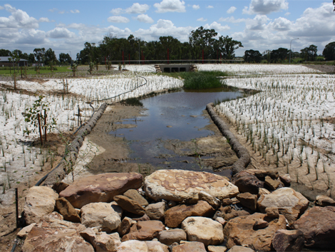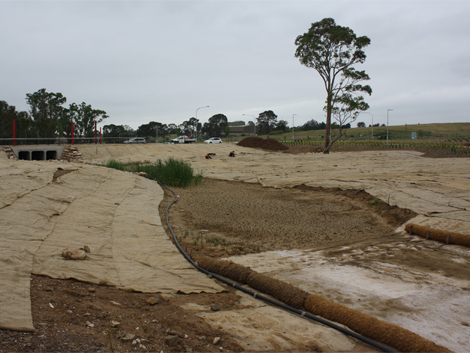 Malmsbury Timbers worked with Total Earth Care Landscaping to specify, supply and install the Jute Matting, Coir Logs and Tree Support material designed to establish a natural green space within a new housing development in Penrith.