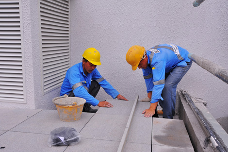 Spacer Tabs used on the pedestals tops enabled consistent gaps to be maintained between pavers for efficient surface drainage. Surface water drains away through these gaps between pavers or the gaps between individual members of the decking panels allowing these areas to dry out fast.