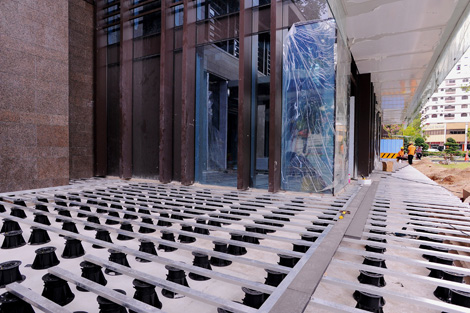 Elmich was involved in the project, supplying their VersiJack Paver and Beam support. The VersiJack height adjustable pedestals support the heavy stone pavers measuring 600mm x 600mm x 50mm at the hotel’s E-Deck and also support metal bearers in the installation of composite wooden decking at the perimeter corridors and ground level pathways of the hotel.