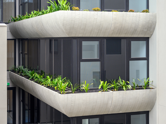 Designed as an integrated feature of the build, the 200 GRC planters created by Satu Bumi for Kirra Gardens are fixed to slabs on each level of the complex. Manufactured in individual sizes to meet specific architectural requirements, many of the planters weigh over a quarter of a tonne. As the planters form the dominant external feature of the structure, some planters needed extended fascia that curved down the front of the planters to ensure a fully integrated appearance. The textured timber finish is a highly customised result that adds depth and dimension to the overall design.