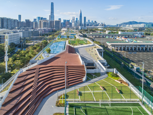 Design firm Crossboundaries partnered with the Shenzhen Nanshan District Government to focus on the development of the roof surface of the existing Shenzhen Metro Line 2 Depot, to create an elevated sports and leisure park to better serve the youth of the densely populated metropolitan environment.