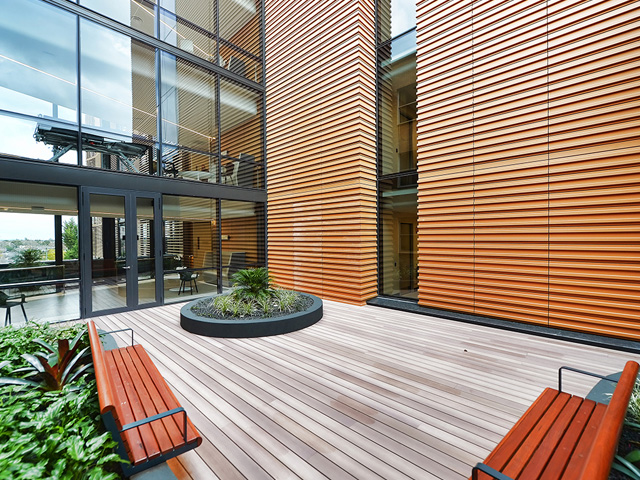 DecoDeck® offers a unique proposition; the durability of aluminium combined with the natural beauty, look and feel of timber. The Super Durable™ powdercoat finish means zero maintenance to retain its appearance, eliminating the use of paints, stains or oils, which release VOCs into the air and could pose a risk to patient health.