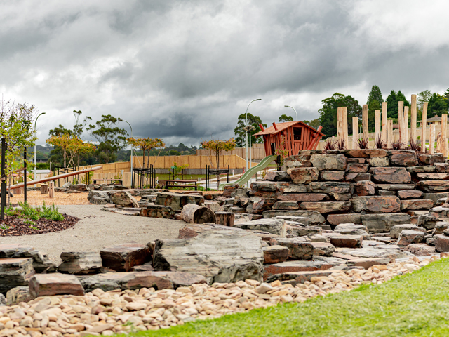 Huge flat boulders, hauled in from the hills of Yea, were carefully placed to create a unique and interesting place for kids to scramble and climb. These elements naturally harness water and carry it down dry-creek beds and under bespoke-built recycled-timber bridges in a mimicry of a natural bushland environment.