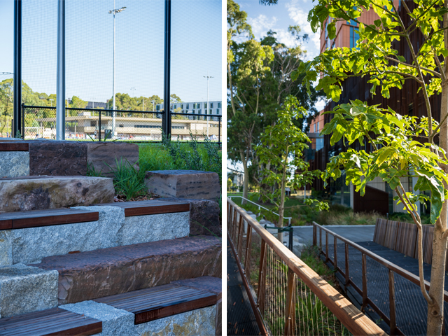 As the walkway approaches the Victorian Heart Hospital there is a notable change in ground levels. To overcome this, PTA Landscapes constructed a boulder amphitheatre, which serves as both a functional and artistic feature, using local split-faced mudstone and silver-grey Harcourt granite to create bleacher seating. Hardwood timber seats are strategically placed throughout, providing visitors with relaxing spaces to unwind and enjoy the surroundings.