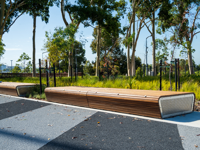 Custom-made seating and rest points line the edges of the corridor, offering visitors comfortable spots to relax, socialise or spectate the activities on the nearby sports fields. These functional design elements encourage interaction and enhance the user experience.