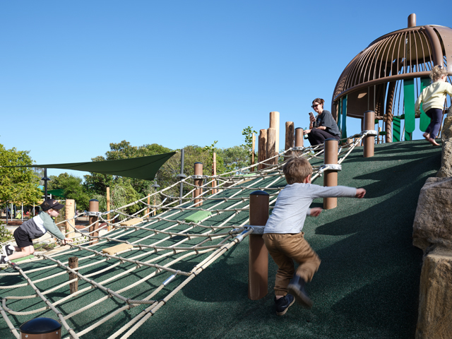 The playground is divided into several zones to cater to different age groups and abilities, ensuring everyone from toddlers to adults has the opportunity to discover and learn through play. For the youngest adventurers, the sand-play Discover Dig and boulder balancing trails foster physical skill development, while older children can test their agility on rock-climbing paths and climb through rope nets to the Macadamia Nut cubby, which offers panoramic views of the landscape.