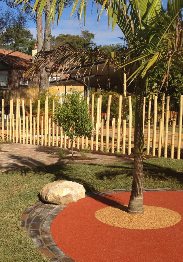 The design considered a balance between quiet and busy places using layering of outdoor rooms. Bamboo poles from House of Bamboo were used cleverly as posts to create a fence and separate play areas. Rather than use traditional fencing the poles provided an elegant natural screen. Poles were placed throughout the play area and blended beautifully with the natural elements of water and sand.